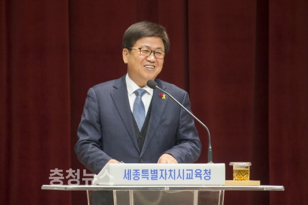 최교진 교육감은 이날 오전 9시 세종시교육청 2층 대강당에서 진행된 시무식에 참석하여 직원들에게 새해 덕담을 전하고 있다.