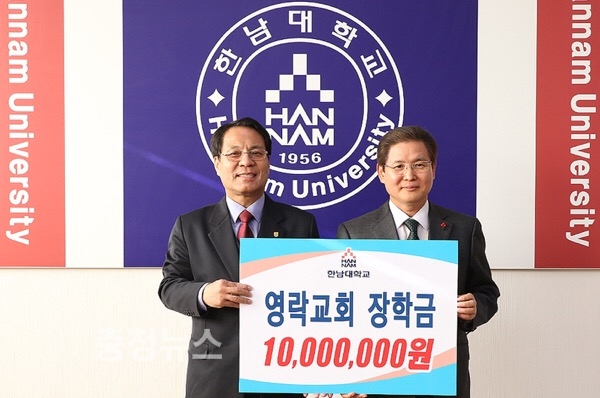 대전영락교회(담임목사 김등모)가 3일 한남대(총장 이덕훈)에 장학기금 1000만원을 기탁했다.