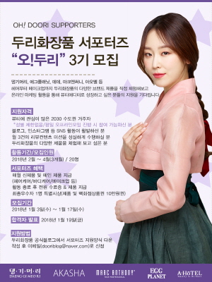 ‘오!두리’ 서포터즈 3기에 참여하려면 두리화장품 공식 블로그(blog.naver.com/dooriblog)에서 서포터즈 지원 양식을 내려 받아 작성 후, 이메일(dooriblog@naver.com)로 신청하면 된다.