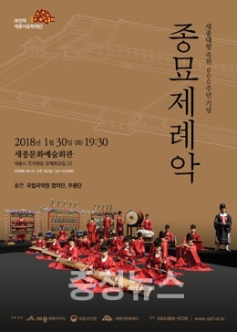 세종시문화재단(대표이사 인병택)은 2018년 첫 번째 기획공연인 ‘종묘제례악’을 오는 30일 세종문화예술회관 대공연장 무대에 올린다.