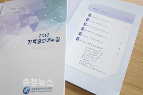 세종시교육청(교육감 최교진)은 2018년 무술년을 맞이하여 교직원 홍보역량강화를 위해 ‘2018 정책홍보매뉴얼’을 새롭게 발간하여 세종시 관내 학교와 직속기관, 본청 직원들에게 보급한다고 9일 밝혔다.