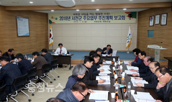 충남 서천군(군수 노박래)은 지난 8일 군청 대회의실에서 ‘새로운 내일을 여는 행복한 서천’ 비전 달성을 위한 ‘2018년 주요업무 추진계획 보고회’를 개최했다.