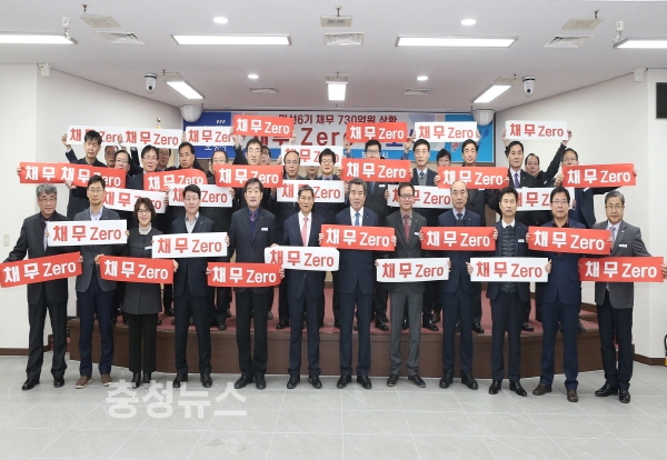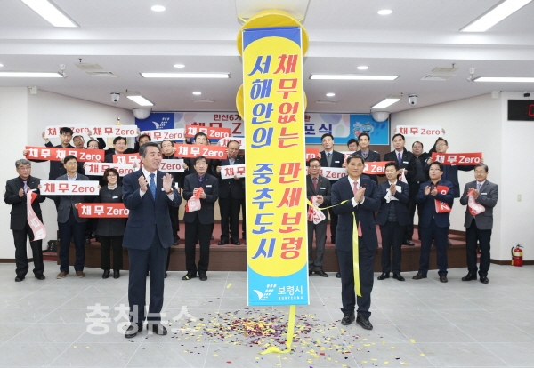 시는 채무 상환계획을 당초 2025년에서 2018년으로 무려 7년을 앞당긴 성과를 축하하기 위해 11일 시청 중회의실에서 김동일 시장과 박상배 보령시의회 의장, 간부공무원 등 30여 명이 참석한 가운데 채무 제로 선포식을 가졌다.
