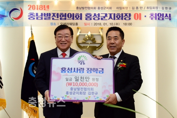 장학회에 따르면 지난 10일 저녁6시 오페라웨딩홀에서 개최된 충남발전협의회장 이·취임식에서 취임한 김한규 회장이 기탁한 1천만원의 장학금과 군 출연금이 쌓이면서 총 103억원의 장학금 조성을 기록했다.