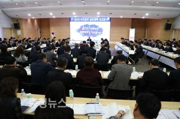 충남 천안시는 ‘더 큰 미래, 더 행복한 천안’ 구현을 위해 15일 시청 대회의실에서 5급 이상 간부, 6급 이하 직원 등 150여명이 참석한 가운데‘2018년 주요업무실천계획 보고회’를 개최했다.