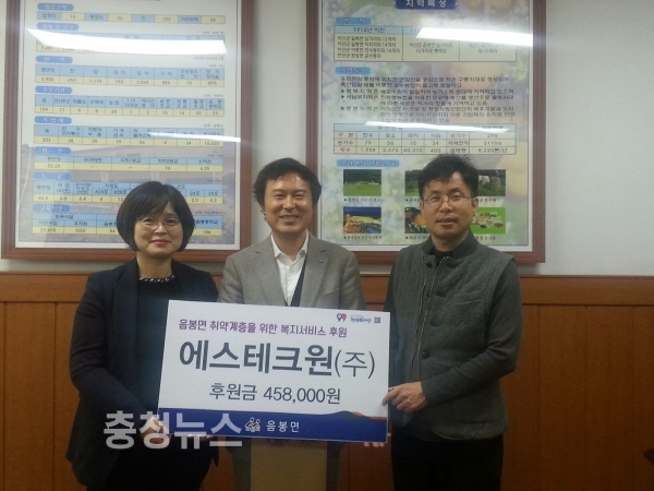 에스테크원(주)(대표 최영)은 지난 16일 직원들이 자발적으로 모금한 후원금 45만 8천원을 지역의 저소득층을 위해 써달라며 음봉면 행복키움추진단(공동위원장 이강수, 김희원)에 전달했다.