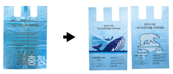 선문대 시각디자인학과 학생들이 바꾼 아산시 공공용 쓰레기종량제 봉투 모습.
