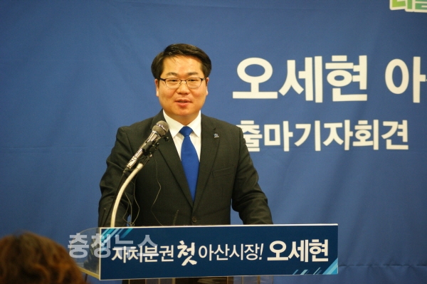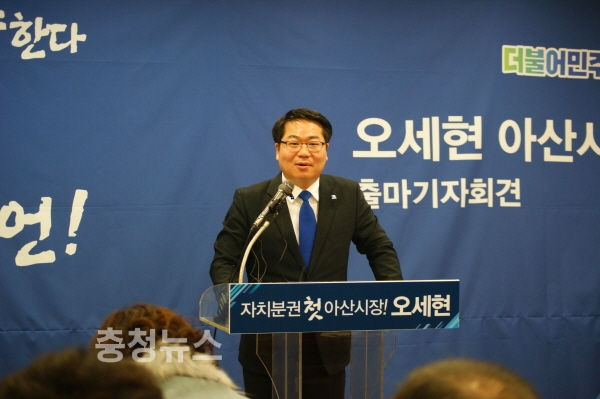 더불어민주당에 입당한 오세현 前 아산부시장이 22일 온양1동 주민자치센터에서 기자회견을 갖고 6.13 전국동시지방선거 아산시장 출마를 공식 선언했다.