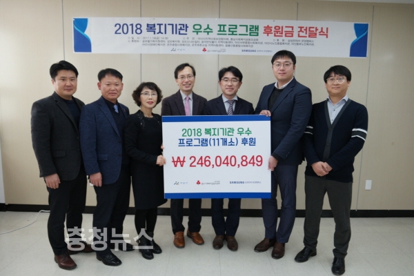 삼성전자 온양캠퍼스는 지난 19일 글로벌가족센터에서 송명희 아산시 복지문화국장, 홍순학 아산시 지역사회보장협의체 실무위원장, 이상덕 충남사회복지 공동모금회 대리, 김관중 삼성전자 온양캠퍼스 부장이 참석한 가운데 아산시 10개 사회복지 기관을 대상으로 ‘2018 우수 사회복지 프로그램 기금’을 전달했다.