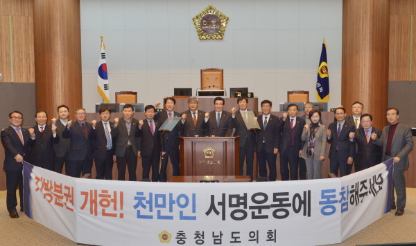 충남도의회가 지방분권 개헌을 위한 천만인 서명운동에 적극적으로 동참키로 하고, 이를 결의하는 행사를 가졌다.