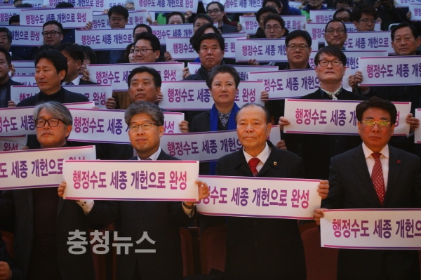 이날 참석자들은 결의대회에 앞서 충청권상생협력기획단 이전 현판 제막식을 가졌다. 이들은 ‘행정수도 세종, 개헌으로 완성’이라는 액자를 부착하며 행정수도 완성을 염원했다.
