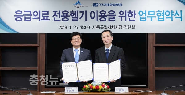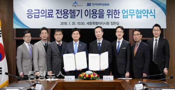 세종시(시장 이춘희)는 25일 청사 내 집현실에서 단국대학교병원과 응급의료전용헬기(닥터헬기) 이용을 위한 업무협약을 체결했다.