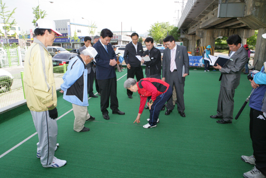 정용기 대덕구청장이 1일 오전 올해 첫 현장행정 방문지인 오정동 오정게이트볼장을 찾아 김선희 회장(71)등 회원들의 건의사항을 듣고 있다