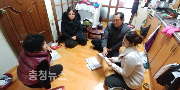 지난 24일 저소득 가구 가정방문 시 고은영 통장(왼쪽부터 두 번째), 정진일 동장(왼쪽부터 세 번째), 이정민 팀장(네 번째)이 대상자(첫 번째)에게 복지상담을 실시하고 있다.]