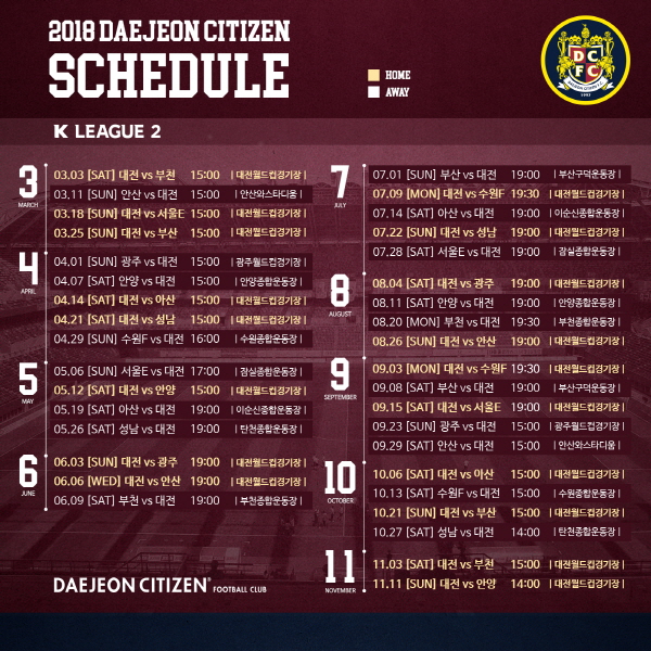 한국프로축구연맹은 25일, 2018시즌 K리그2 일정을 공시했다. 대전은 3월 3일 토요일 오후 3시 대전월드컵경기장에서 부천과 홈 개막전을 치른다.