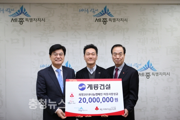 계룡건설 이승찬 사장은 25일 세종시청을 방문해 이춘희 세종특별자치시장과 홍영섭 세종 사회복지공동모금회장 등이 참석한 ‘희망 2018 나눔캠페인’ 성금전달식에서 성금 2000만 원을 기탁했다.