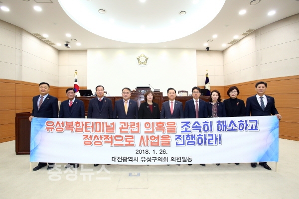 유성구의회 의원들이 유성복합터미널 사업 정상화를 촉구하고 있다.