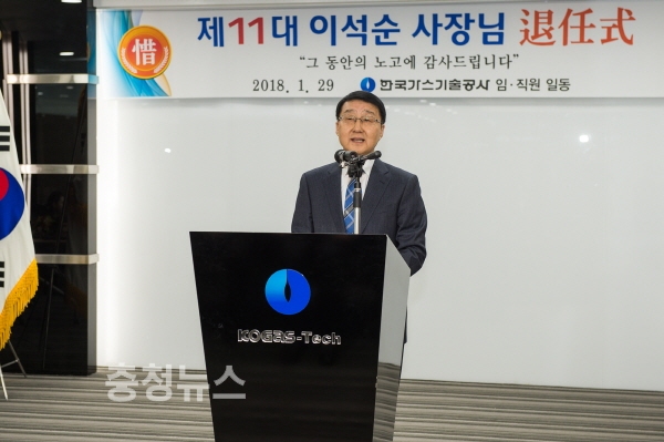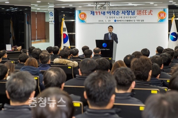 한국가스기술공사 제11대 이석순 사장 퇴임식이 29일 대전 본사 사옥 1층 대강당에서 전직원이 참석한 가운데 개최됐다.