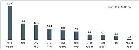 대전·세종지역 기업들이 생각하는 구직자 취업의 주요 결정요인으로 ‘임금(31.7%)’을 꼽았으며, ‘적성(15.1%)’, ‘근무시간(13.5%)’ 등 답변이 뒤를 이었다.
