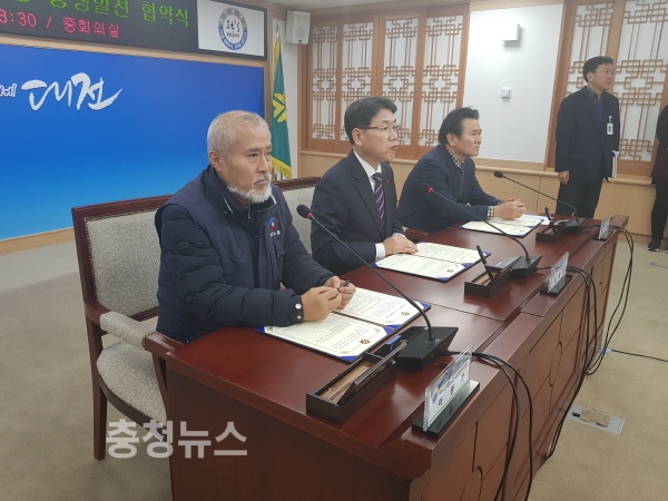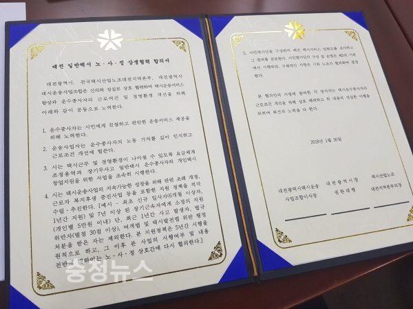 시는 이종호 전국택시산업노조 대전지역본부 의장과 김성태 대전광역시택시운송사업조합 이사장이 함께 회사택시 운수종사자들의 열악한 근무여건 개선에 힘을 모으기로 합의하고 이날 시청 중회의실에서 상생 협약식을 가졌다.