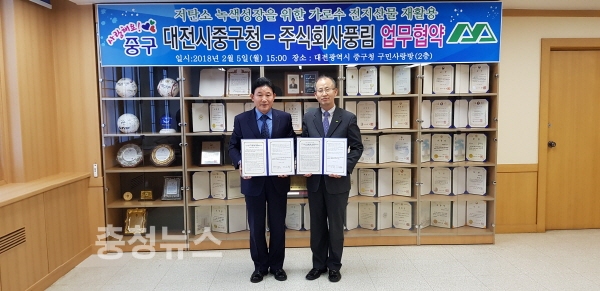 대전 중구(구청장 박용갑)는 5일 ㈜풍림(대표이사 전경옥)과 저탄소 녹색성장 제고를 위한 가로수 전지산물 재활용 업무협약을 체결했다.