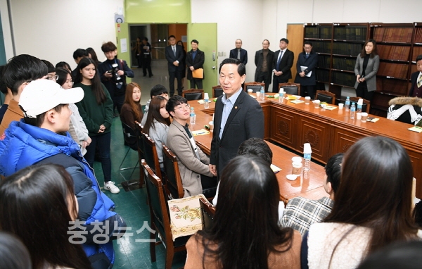 이어 김상곤 장관은 10시 40분, 충남대 도서관 3층 회의실에서 국가교육근로 장학생들과의 간담회를 가졌다.