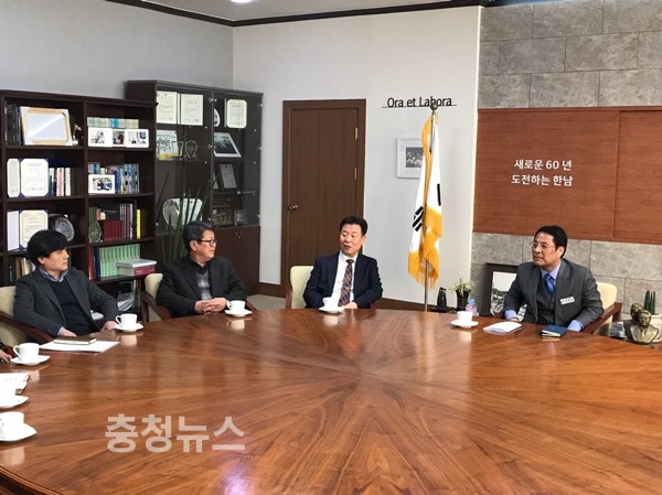 박대범 총동문회장(사진 오른쪽 두 번째) 등 발족위원들이 이덕훈 총장(맨 오른쪽)을 만나고 있다.