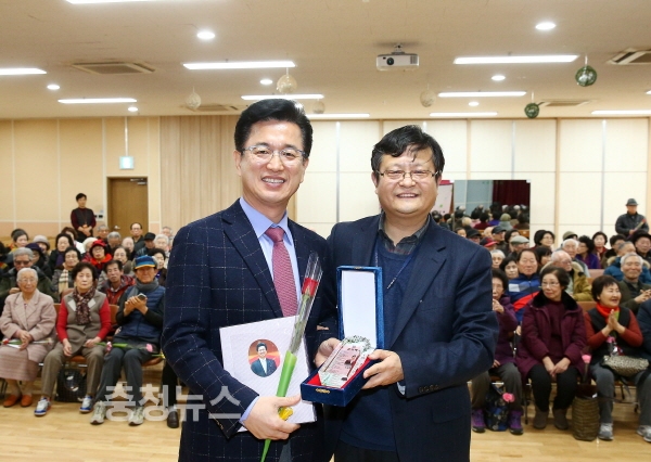 8일 오후 유성구 노인복지관에서 허태정 유성구청장(왼쪽)이 류재룡 노인복지관장(오른쪽)으로부터 노인복지에 기여한 공으로 감사패를 수여받고 있다.