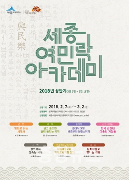 세종시문화재단(대표이사 인병택)은 지난 7일부터 세종여민락아카데미 2018년 상반기 정기강좌 수강생을 모집한다.