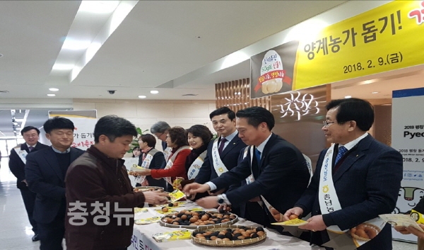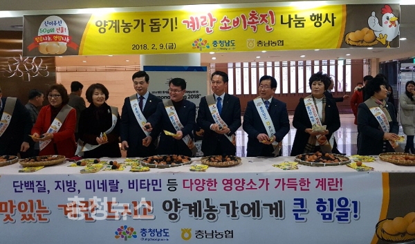 농협 충남지역본부(본부장 조소행)는 최근 살충제 파동 및 AI(조류인플루엔자)로 어려움을 겪고 있는 양계농가를 돕기 위해 9일 충남 홍성군 홍북읍 내포신도시에 위치한 충남도청에서 계란 소비촉진 나눔행사를 개최했다.