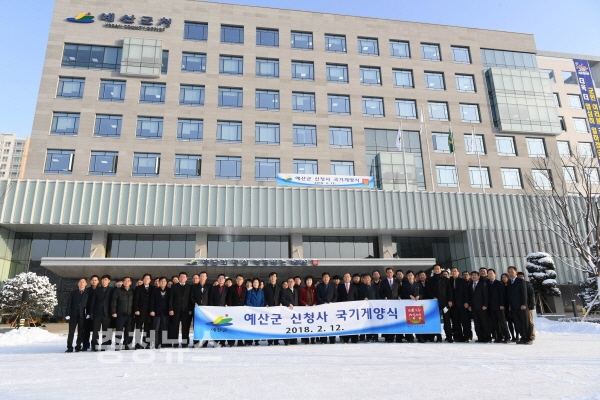 충남 예산군이 12일 새로운 청사에서 국기게양식·신청사 표지석 제막식을 개최하며 공식적인 업무 개시를 알렸다.