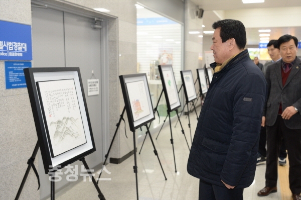 10일 나태주 시인작품 특별전을 둘러보고 있는 오시덕 시장