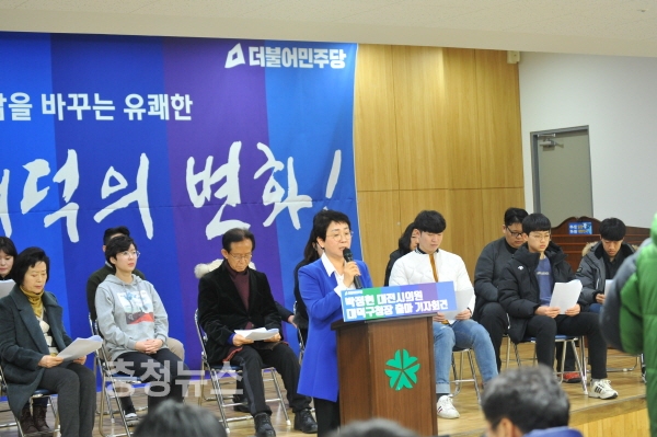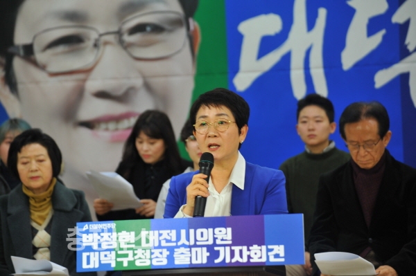 박 의원은 이날 대덕구 오정동 농수산물도매시장에서 기자회견을 열고 “대덕구에서 훈련하고 배웠던 능력과 미래를 제시하고 실현할 줄 아는 능력을 발휘해 구민들의 자존심을 살리고 대덕구를 기회의 땅으로 변화시켜 새로운 역사를 쓰겠다”고 출마의 변을 밝혔다.