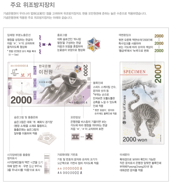 확대경으로 봐야 확인이 가능한 작은 문자로, 은행권 앞뒷면 볼록인쇄 부위에 ‘Pyeong Chang 2018’ 등 대회 관련 문자를 적용했다.