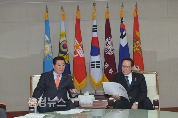 윤석우 의장이 송영무 국방부장관에게 업무협약 사항을 건의하고 있다.