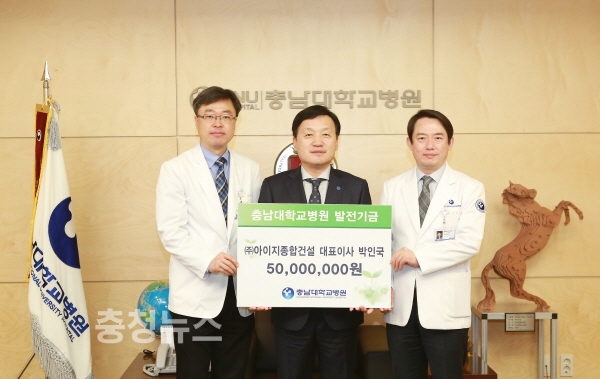 충남대학교병원(원장 송민호)은 19일 (주)아이지종합건설 박인국 대표이사로 부터 충남대학교병원 발전기금 5천만원을 기부 받았다.
