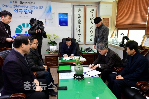 충남 홍성군과 홍성지역건축사회는 20일 군수실에서 홍성군수, 허가건축과장, 홍성지역건축사회장과 지역건축사회이사 등이 참여한 가운데 찾아가는 건축 민원 상담실 운영을 위한 상호협력을 위한 업무 협약을 체결했다.