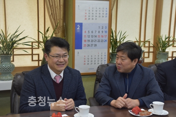 복기왕 예비후보가 20일 오전 논산시청을 방문하고 황명선 시장과 면담을 가졌다.