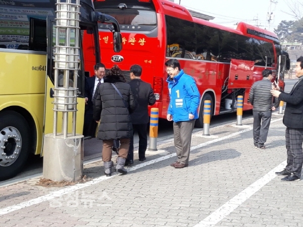 복기왕 예비후보가 평창올림픽 현장으로 떠나는 논산시 응원단들과 인사를 나누고 있다.