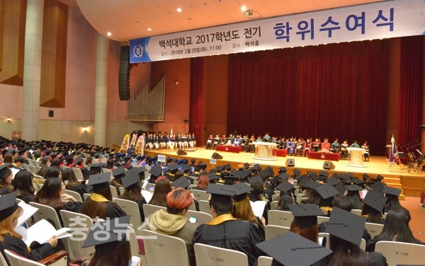 백석대학교(총장 장종현)는 20일 2017학년도 전기 학위수여식을 개최했다. 이날 졸업생이 후배들을 위해 300만 원을 기탁해 눈길을 끌고 있다.