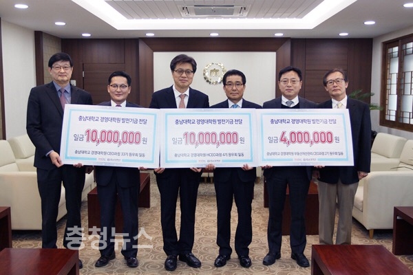 충남대 경영대학원이 운영중인 3개 최고위과정 원우회가 대학 발전을 위해 써달라며 발전기금을 기부했다.