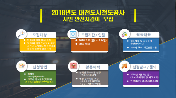 대전도시철도공사는 시민의 시각에서 도시철도의 위험 요인을 모니터링하는 안전지킴이(Safety Keeper) 30명을 오는 3월 4일까지 모집한다.