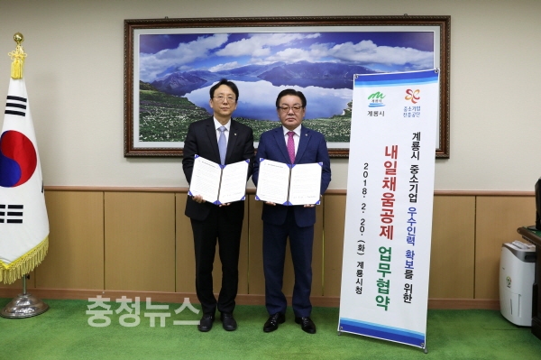 충남 계룡시(시장 최홍묵)가 지난 20일 시청 집무실에서 중소기업진흥공단 대전세종지역본부와 ‘계룡시 내일채움공제 업무협약식’을 가졌다.