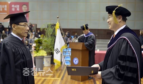75세에 학사모를 쓴 ‘월남전 파병용사’ 허영남(복지신학과) 씨와 선천성 청각장애 체육학도로 소중한 생명 5명을 구한 이상현(레저스포츠학과) 씨는 이날 특별공로상을 받았다.