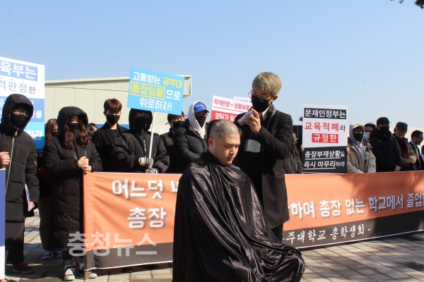 특히, 최동호 총학생회장은 삭발식을 단행하며 “대법원 판결이 남아 있다는 이유로 공주대를 제외하고 전주교대, 방통대 총장만 임용한 것은 대학 정상화와 올바른 학사운영을 기대한 우리대학 구성원에 찬물을 끼얹었다”고 밝혔다.