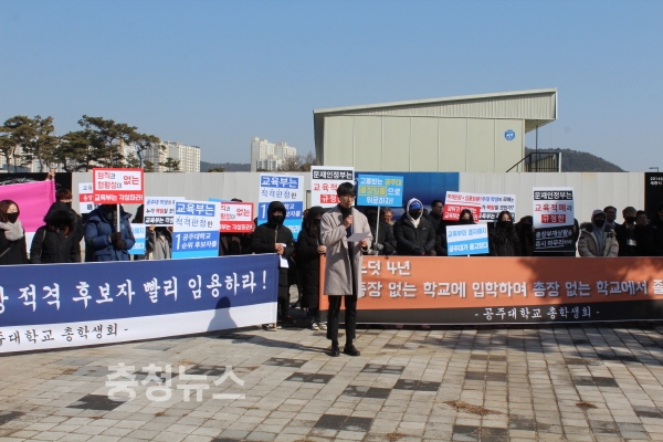 집회에 참여한 학내 단체들은 공동성명을 통해 “대학 구성원이 합법적인 절차를 통해 선정한 1순위총장임용후보자가 47개월 동안 이유도 없이 임용되지 못하는 전대미문의 사태가 발생했다”면서 “총장공백에 따른 피해는 고스란히 학생들에게 돌아가고 있다”고 지적했다.