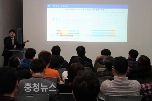 (주)뉴딘이 자체 개발한 스크린볼링 시스템인 '뉴딘VR볼링' 시연회에서 윤정훈 사업부장이 참석한 예비창업자들에게 국내 볼링 산업 현황과 '뉴딘VR볼링' 사업 전망에 대해 소개하고 있다