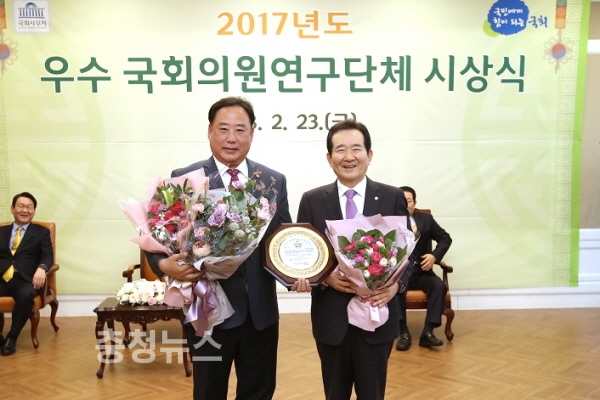 더불어민주당 어기구 국회의원(충남 당진시)이 공동대표를 맡고 있는 국회철강포럼이 2016년에 이어 ‘2017년 우수 국회의원연구단체’에 2년 연속 선정됐다.(왼쪽 어기구 의원, 오른쪽 정세균 의장)
