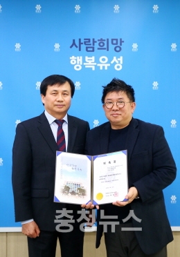 이원구 유성구청장 권한대행(왼쪽)이 김광회 축제총감독(오른쪽)에게 위촉장 수여 모습