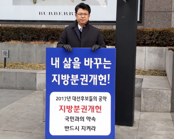27일 온양온천역에서 자치분권 개헌을 촉구하는 1인 시위에 나선 복 예비후보는 “우리 당 소속 후보들이 공동 입장을 내고, 문재인 대통령과 당에 힘을 보태자”고 제안했다.